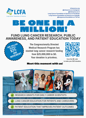 Download and share this flyer with your community, workplace, or social networks. Every person who sees it is one step closer to becoming one in a million for lung cancer research funding.